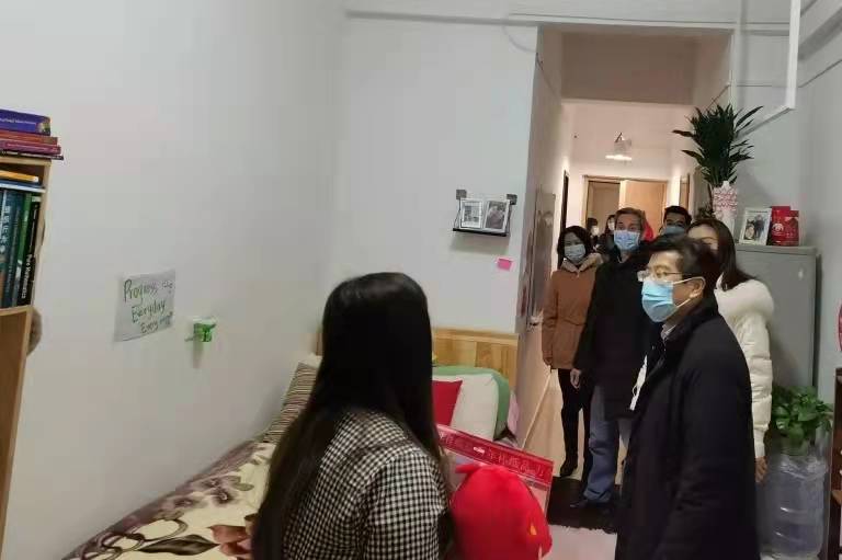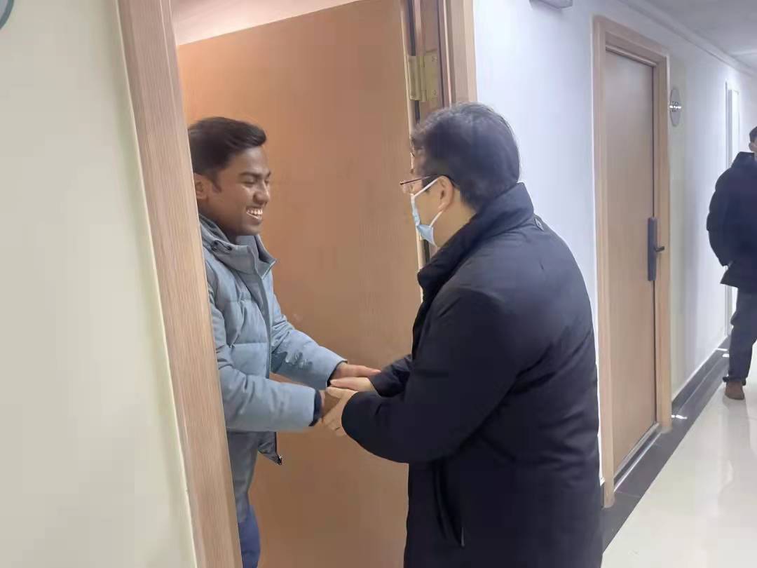 彭双阶副校长一行还深入宿舍,了解国际学生生活情况,先后看望了土库曼斯坦籍本科生迪丽、孟加拉籍硕士研究生阿克那、萨摩亚籍本科生方思思、圣多美林西比籍本科生向阳。彭双阶与同学们亲切交流,关心他们的学业和生活情况,叮嘱大家防寒保暖,严格遵守防疫规定,并祝愿他们在桂子山能够度过一个难忘而美好的中国年。
