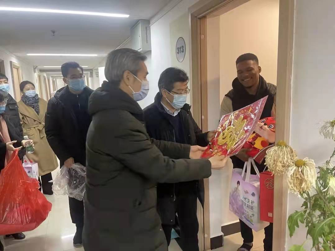 1月25日下午,我校在国际学生宿舍六号楼举行在校国际学生春节慰问,副校长彭双阶、国际文化交流学院(留学生管理工作办公室)党总支书记王琍、院长(主任)高卓献、副院长(副主任)孙焱、左双菊以及留管干部出席活动,为寒假留校的国际学生发放新年礼盒,送去学校的关心和问候,和国际学生一起喜迎2022年新春佳节。