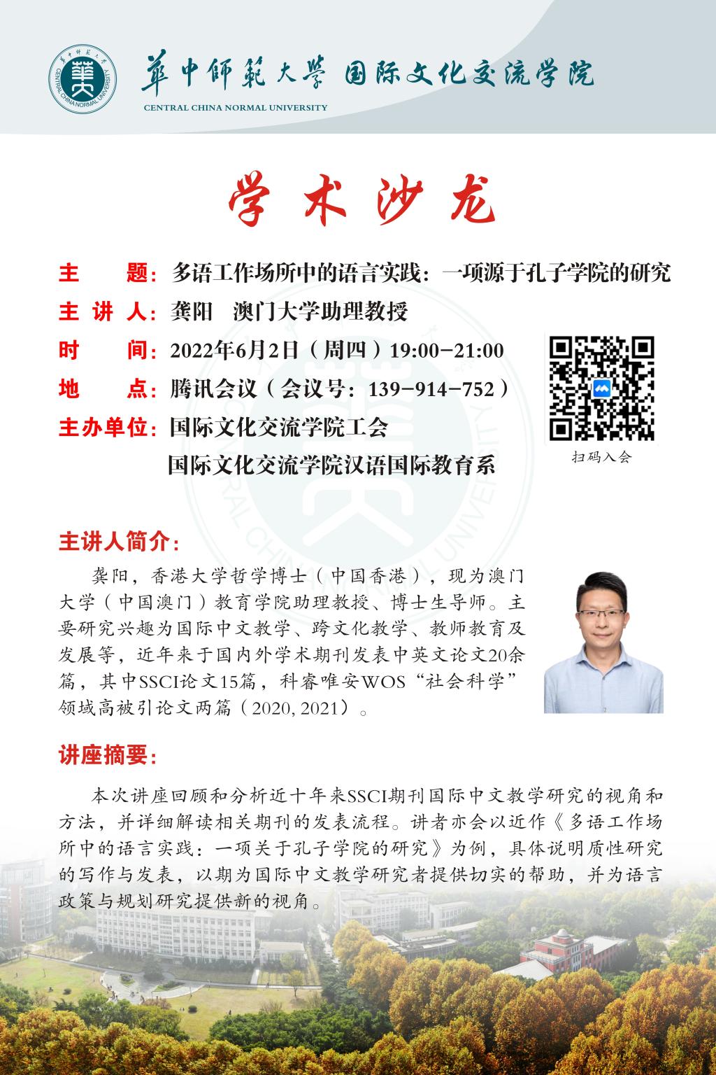 学院此次邀请了澳门大学助理教授龚阳为全院教职工开展题为“语工作场所中的语言实践:一项源于孔子学院的研究”的讲座。龚阳老师近年来于国内外学术期刊发表中英文论文20余篇,担任10余本国际SSCI期刊、AERA等国际学术会议以及Taylor & Francis, Springer Nature, Palgrave Macmillan国际出版社评审专家。他的主要研究兴趣为国际中文教学、跨文化教学、教师教育及发展等。本次讲座中,龚阳老师回顾和分析近十年来SSCI期刊国际中文教学研究的视角和方法,并详细解读相关期刊的发表流程。他以孔子学院的研究为例,具体说明了质性研究的写作与发表,为语言政策与规划研究提供了新的视角。