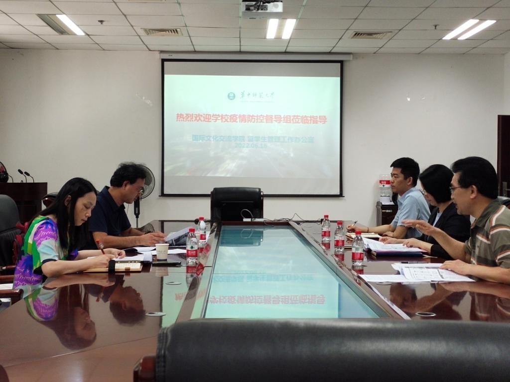 6月16日上午,学校疫情防控督查组莅临国际文化交流学院(留学生管理工作办公室)检查2022年春季学期以来疫情防控工作,校长助理、学校纪委委员、培训中心分党委书记林更茂,学校纪委办公室副主任兼副处职纪检监察员李静出席,学院党总支书记王琍、副院长孙焱、学生事务办公室主任陈楠参加座谈。