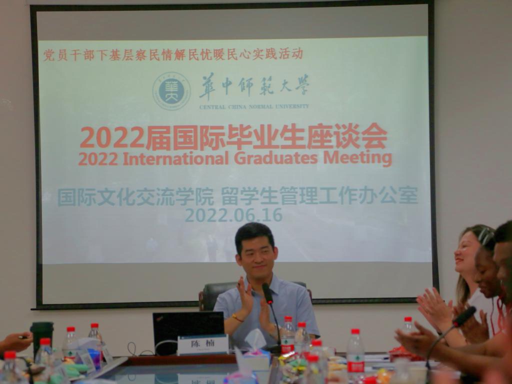 为贯彻落实学校党委关于开展党员干部下基层察民情解民忧暖民心实践活动要求,切实走好新时代党的群众路线,6月16日下午,我院开展党员干部下基层察民情解民忧暖民心实践活动暨2022届国际毕业生座谈会。副校长彭双阶,政治与国际关系学院国际政治系主任赵长峰教授,心理学院程晓荣副教授,经济与工商管理学院工商管理系副主任谢志鹏副教授,学院党总支书记王琍、院长高卓献、副院长左双菊出席,学院行政人员代表和在校国际毕业生参加座谈。座谈会由学生事务办公室主任陈楠老师主持。