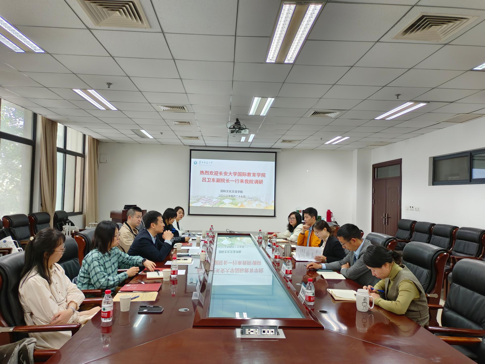 4月27日上午,长安大学国际教育学院吕卫东副院长一行来我院调研,我院左双菊副院长、预科部刘建立主任、学工办陈楠主任、教学办游梦佳主任及招办王飞畅主任参会。