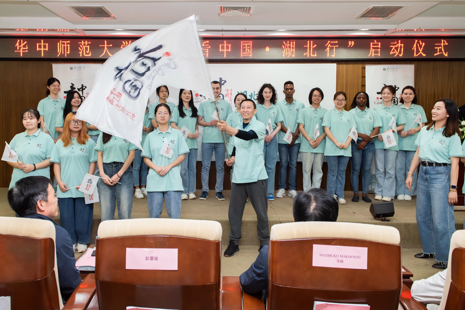“2023看中国·湖北行”全体项目组成员依次自我介绍并合影。罗军向中外青年代表授旗。