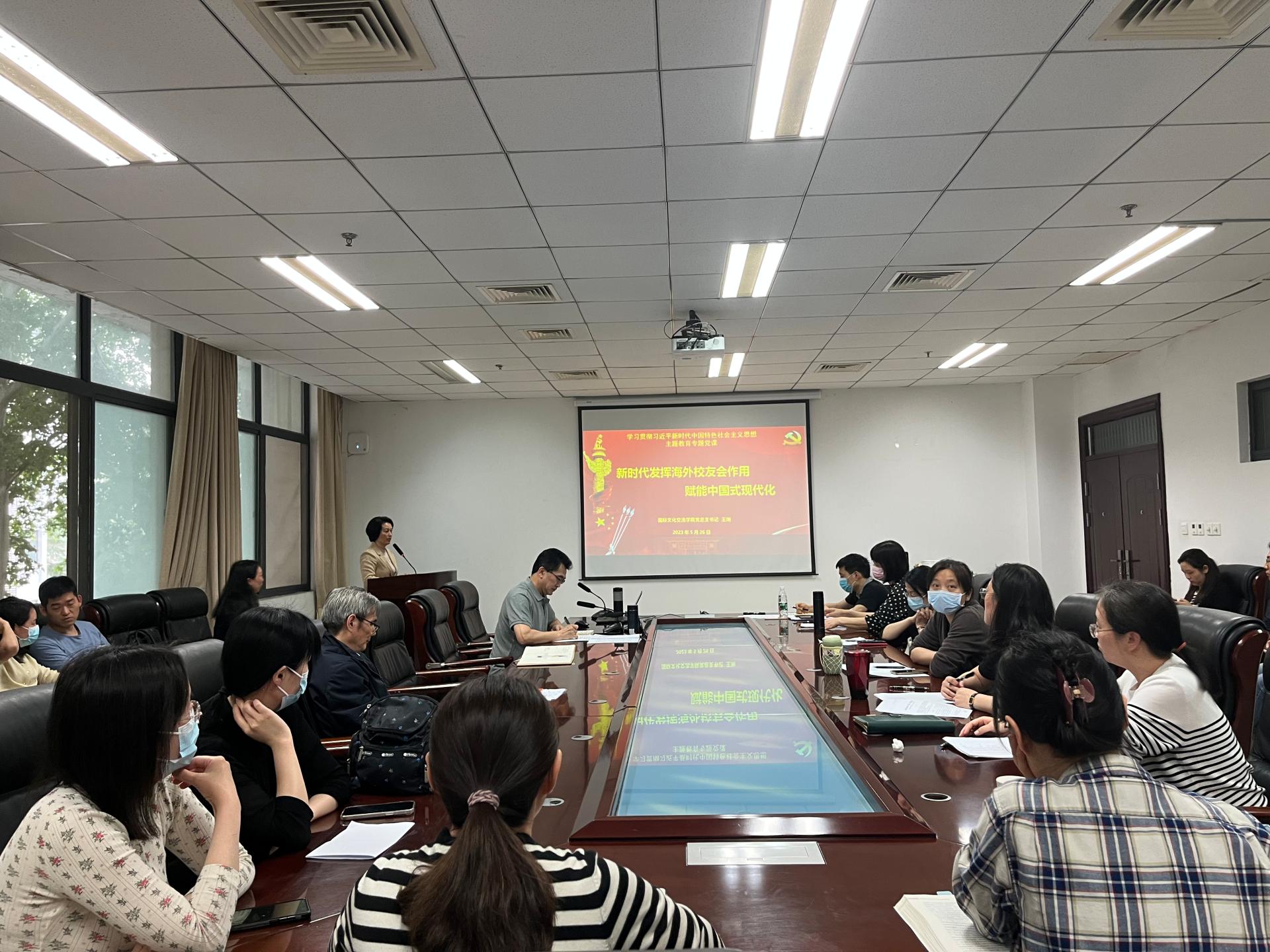 党总支书记王琍以《新时代发挥海外校友会作用,赋能中国式现代化》为题为全院教职工讲授主题教育专题党课。主要包括习近平总书记关于“必须坚持胸怀天下”重要论述,新时代发挥华中师范大学海外校友会作用,以及我校海外校友赋能俄罗斯、亚美尼亚2023年HSK中国留学就业展等三部分内容。她指出要认真学习贯彻习近平新时代中国特色社会主义思想主题教育,深入调查研究,注重调研成果转化运用,示范带动主题教育走深走实,确保主题教育取得扎实成效。