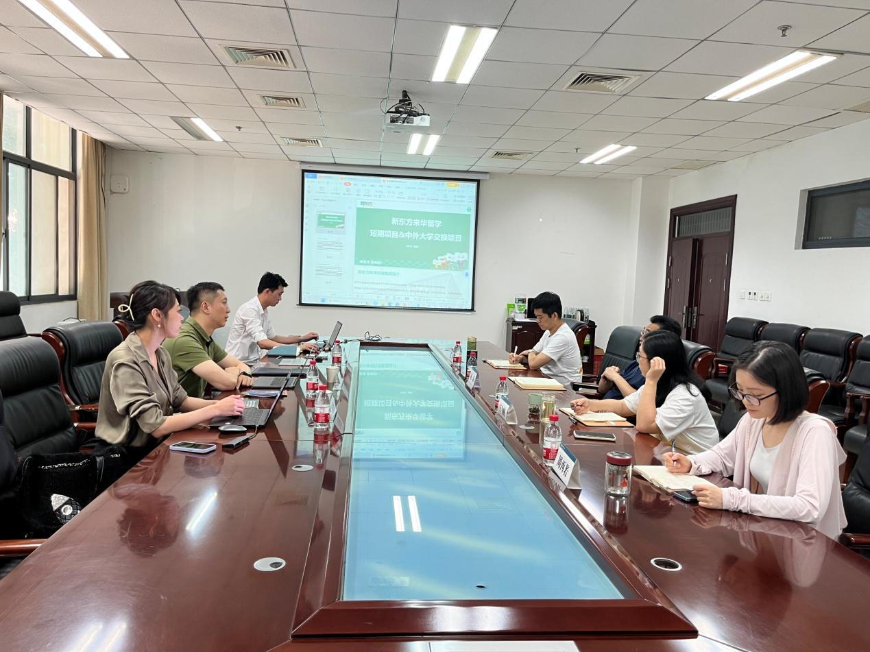 新东方前途出国咨询有限公司来华留学部高校对接专员韩旭和王星辰分别就该公司近期策划和开展的国际学生短期项目、中外大学交换项目、高校海外线上投放、国际学生社会实践等方面进行介绍。朱政副总监表示,希望通过此次访问进一步加强与我校的沟通联系,深入探讨合作模式,帮助我校搭建与海外高校的联络桥梁,扩大我校在国际学生群体中的影响力。