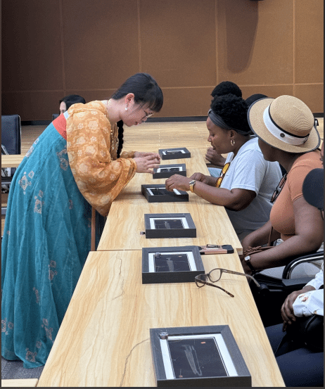 随后,活动转至博物馆研学中心,开启了留学生们的亲身体验时刻。在这里,大师们深入浅出地讲解汉绣的历史渊源与文化内涵,从楚汉文化的滋养到荆楚大地的传承,留学生们听得津津有味,对汉绣的认识逐渐深入。