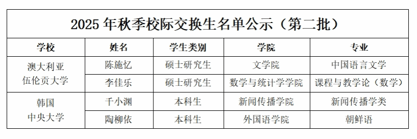 据我校2025年秋季校际交换生项目(第二批)相关要求,在个人申请的基础上,经国际合作部审核遴选,拟选派文学院陈施忆等4名同学赴海外学习交流。