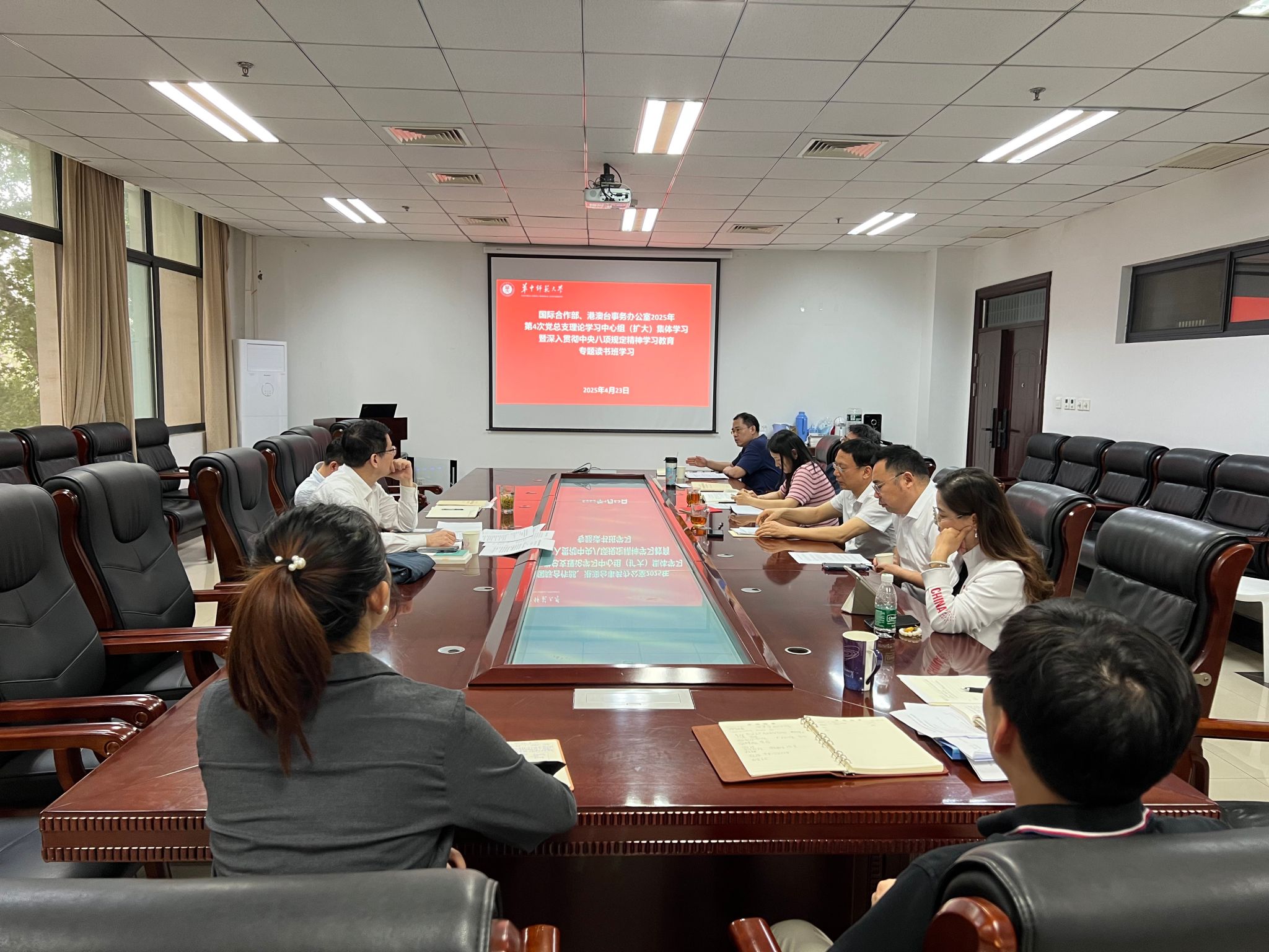 4月23日下午,国际合作部、港澳台事务办公室党总支理论学习中心组于310会议室开展2025年第4次集体学习暨深入贯彻中央八项规定精神学习教育专题读书班学习。党总支中心组全体成员、领导干部、党支部书记等参加学习。党总支书记曹青林主持学习。