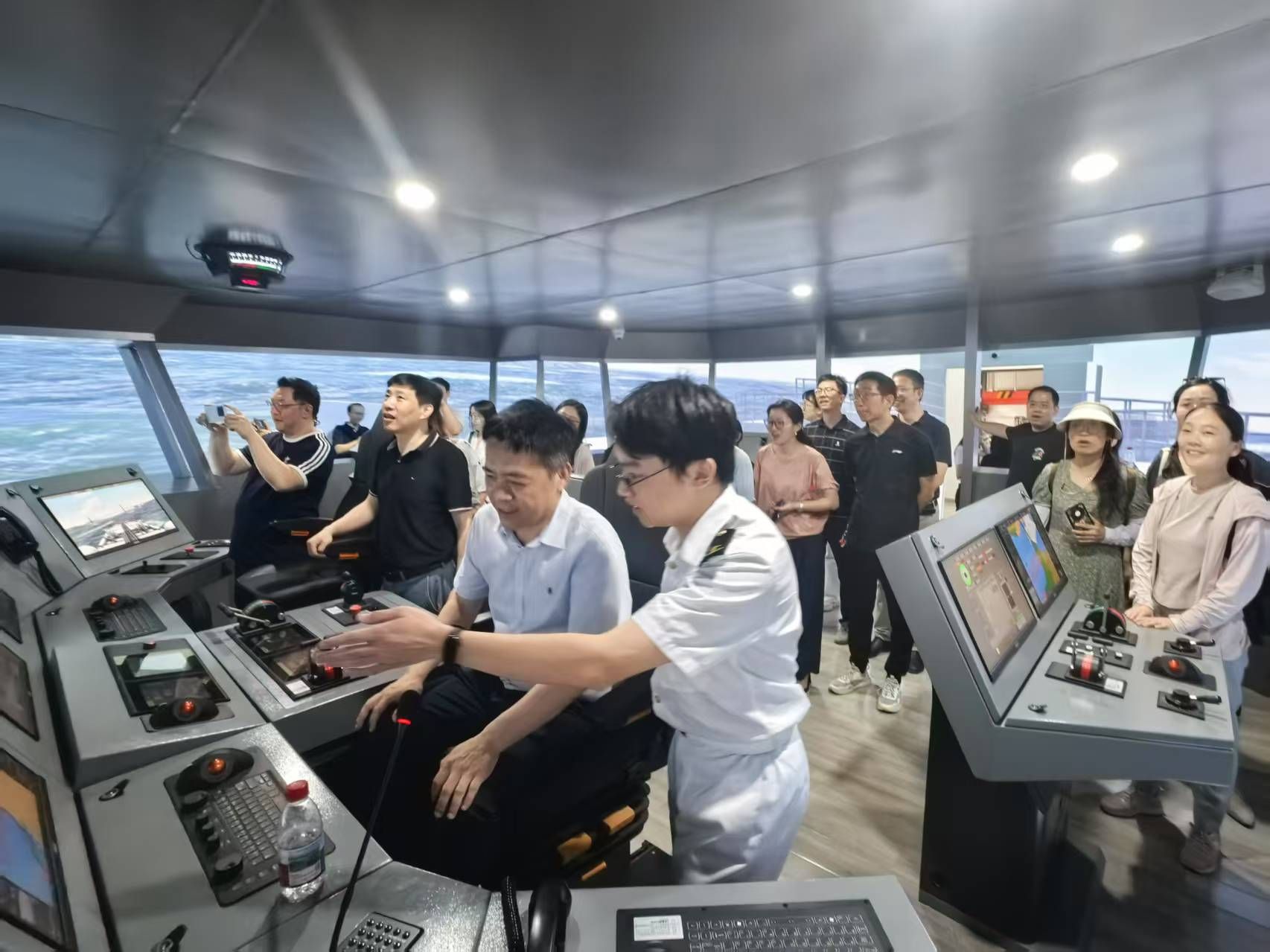 在智能航运中心模拟驾驶舱,大家兴致勃勃地坐上驾驶位,体验了船舶驾驶的乐趣。模拟系统高度还原了真实的航海环境和各种突发情况,体现了现代航运的智能化和自动化水平。通过亲身体验,大家对船舶航运有了更深入的了解,也对未来船舶工业的发展充满了期待。