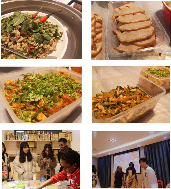 接下来是品菜环节。同学们大展身手,开始了一场各国的“美食展”。老挝同学带来了老挝的国民主食“糯米饭”和老挝最著名的代表菜之一的Lahp;越南同学带来了美味的越南春卷;赤道几内亚的同学烤土豆;乌兹别克斯坦的同学准备了色香味俱全的凉菜;塞舌尔的同学分享了咖喱鸡……此外,王老师还特意为大家准备了北京烤鸭,在《新年快乐》的音乐之下品尝各国美食,大家都十分满足。