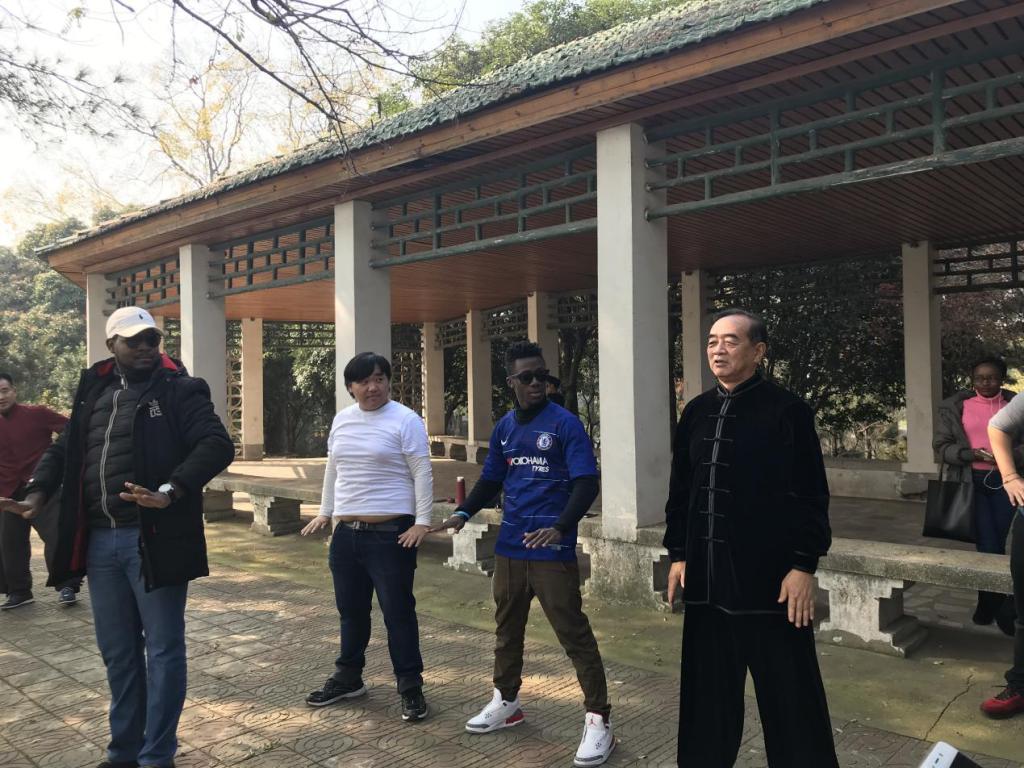 景区内一座长亭处,几位中国老者正在打着太极拳。远远地,就有同学兴奋地叫道:“打太极拳!”他们饶有兴趣地观看着老人们的太极拳功夫,鼓掌称好!几名热情的同学主动请老人教他们打太极拳,看着他们一丝不苟地学习中国传统文化的样子,真的是可爱极了。