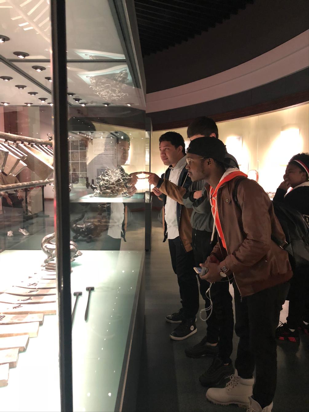 上午九点留学生在老师的带领下到达武汉省博物馆,依次参观了《楚文化展》、《古代瓷器专题展》、《荆楚百年英杰》、《长江中游的青铜文明》、《曾侯乙墓》、《战国秦汉简牍》、《秦汉漆器艺术》等十多个展厅,参观过程中留学生无不惊叹华夏历史之悠久、中国文化之瑰丽。在馆内留学生们还一起欣赏了许多其他的中华古物,同学们也表示中国许多古老的制造技艺让他们叹为观止。同学们感受最深的展品是著名的越王勾践剑和曾侯乙编钟,其做工之精妙确实无法言说。灯光迷蒙的展厅内安静地伫立着庞大的古老乐器,编钟上的青铜龙纹在昏黄灯光的照射下显得尤为华贵。展厅四处都透露着一股神秘气息,同学们安静的驻足欣赏,偶尔轻声感叹,仿佛置身在历史长河中。