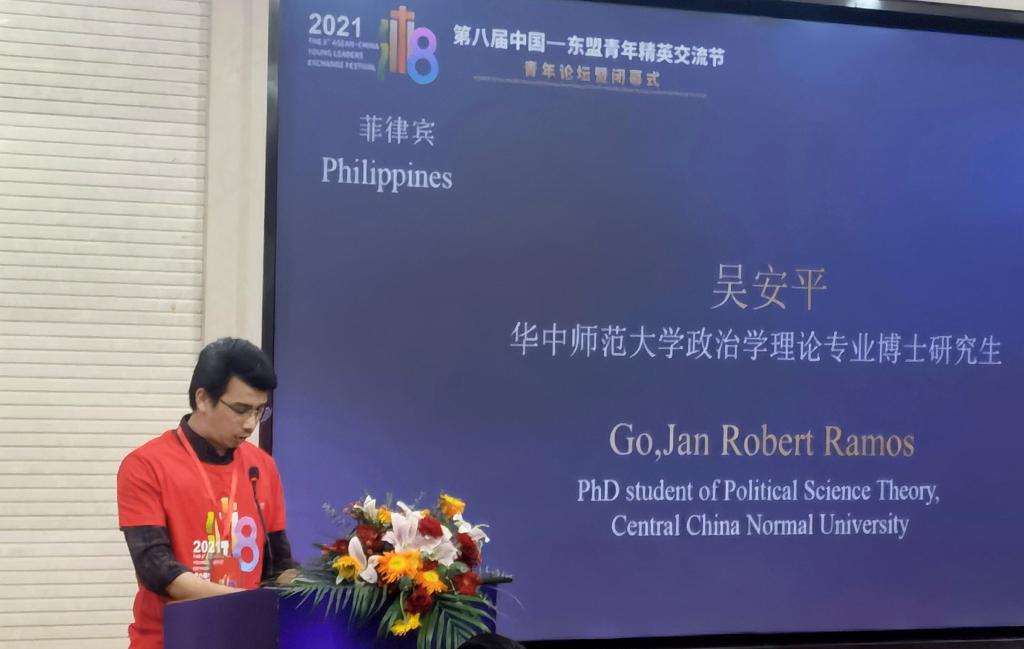 闭幕式上,中外青年代表围绕“我眼中的中国,我期待的亚洲”主题畅所欲言,为构建更加紧密的中国—东盟命运共同体、建设更加美好的亚洲发出青年声音。我校菲律宾籍博士生吴安平作为国际学生代表发言,他分享了自己参加此次活动的收获,感谢中国政府以及华中师范大学在疫情期间对东盟国际学生的关爱,感悟中国-东盟深厚友谊的重要意义,“我们结识了新朋友,架起了新的桥梁。”