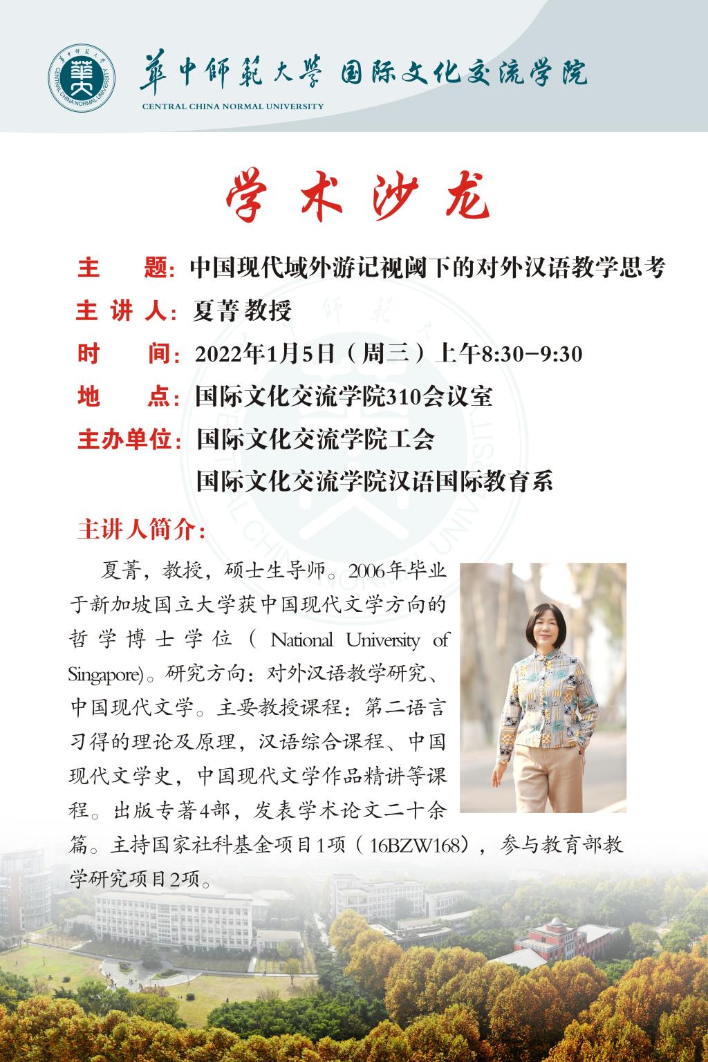 2022年1月5日上午,国际文化交流学院在310会议室开展2022年第1次学术沙龙活动。本次活动由学院工会和汉语国际教育系共同举办,邀请华中师范大学国际文化交流学院夏菁教授为全院教师开展讲座。学院党总支书记王琍出席活动,活动由副院长左双菊教授主持。