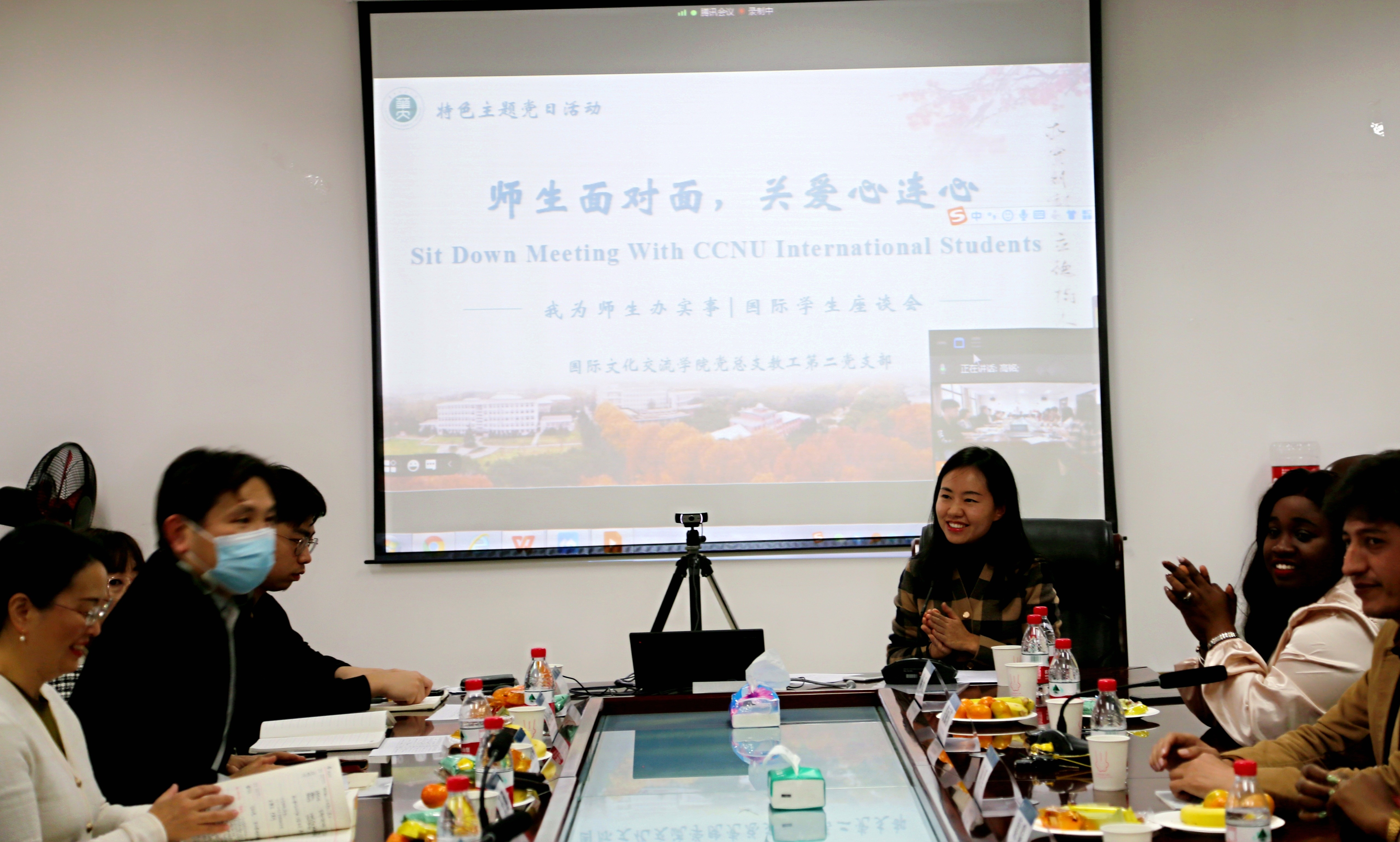 为进一步贯彻落实习近平总书记在党史学习教育动员大会上的讲话精神、习近平总书记给北科大巴基斯坦和北大留学生的回信精神,扎实推进“我为师生办实事”实践活动,2021年11月1日下午,国际文化交流学院教工第二党支部组织召开了“我为师生办实事”特色主题党日活动——“师生面对面,关爱心连心”国际学生座谈会。学院党总支书记王琍、院长高卓献、副院长孙焱、副院长左双菊、教师代表、行政人员以及9名国际学生代表参加座谈会。
