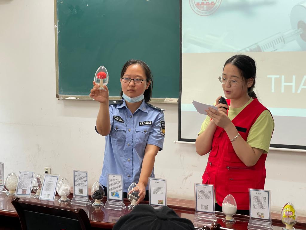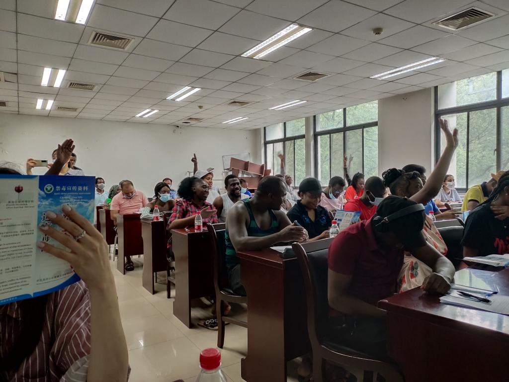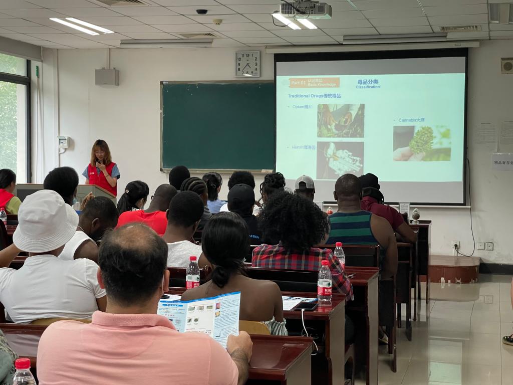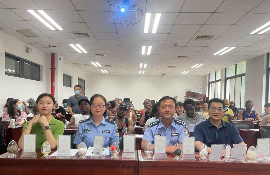 洪山区禁毒办潘刚警官、胡妍警官及三位来自于华中农业大学的志愿者共同为我校国际学生带来一堂生动的禁毒教育宣讲,帮助国际学生了解中国对毒品的定义、新型毒品的危害及远离毒品的方法;刘文娟警官着重介绍了中国禁毒法律法规和违法行为后果。讲座上,国际学生踊跃提问,警官们积极回应,会场讨论气氛浓厚热烈。越南籍博士生邓月娟表示,非常感谢学校对国际学生的关心和关爱,为学生提供接受禁毒教育、了解毒品危害的机会,通过学习禁毒知识,自己深刻认识到远离毒品、遵守中国法律的重要性。