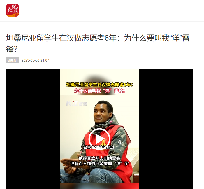 学雷锋纪念日当天,湖北省人民政府网官方公众号发布《武汉“洋雷锋”:春光如期 追“锋”不怠》的文章,报道“洋雷锋”的公益献血活动,来自塞内加尔的郭飞龙说,“帮助别人能收到他们的善意和感谢,看到他们高兴我也很高兴。虽然国度不同,语言不同,肤色不同,但是我们都秉持“赠人玫瑰,手留余香”的人生信条”;