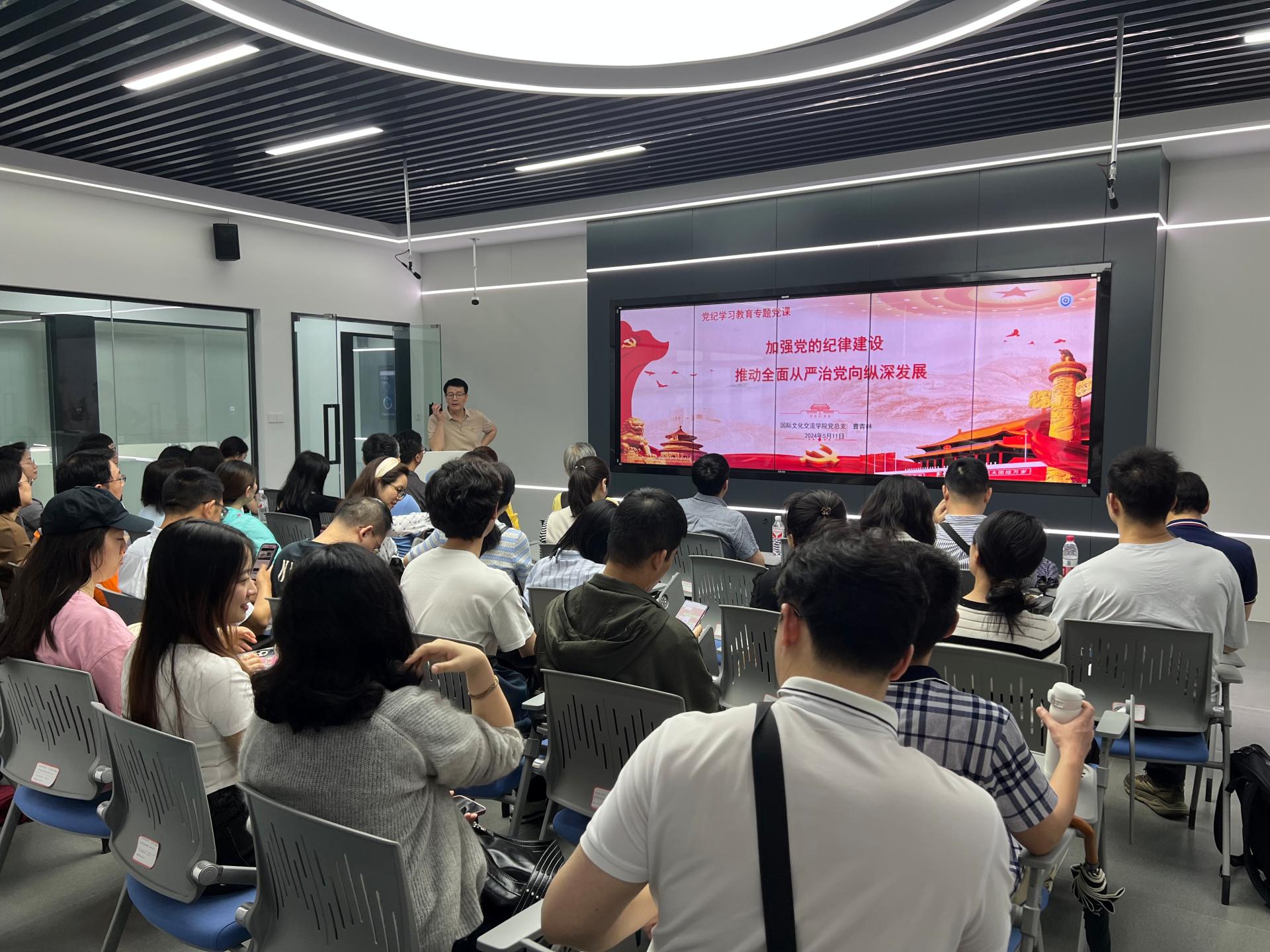 在武汉智能教育产业技术研究院会议室,国际文化交流学院党总支书记曹青林主持开展了党纪学习教育专题读书班第2次集中学习,讲授了题为《加强党的纪律建设,推动全面从严治党向纵深发展》的专题党课,回顾了党的纪律建设历史进程,明确了党纪学习教育的目标要求和重要意义,重点领学了《中国共产党纪律处分条例》的修订背景和修订意义,领读领学了《中国共产党纪律处分条例》第一章“总体要求和适用范围”和第二章“违纪与纪律处分”,对违纪典型案例进行了深入剖析,强调高质量开展党纪学习教育必须注重融入日常、学用结合。