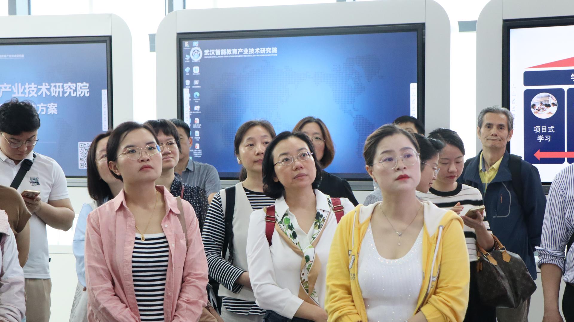 随后,一行人前往位于江夏区的武汉智能教育产业技术研究院,进行了实地考察。研究院多功能展厅陈列了国家工程中心在教育大数据领域的研究成果和创新应用。依托智能化的展示设备,教师们得以在视觉与感官上获得极为丰富的体验,全方位地见证了工程中心自创立以来,在教育大数据领域所取得的核心关键技术突破、深入的应用研究以及一系列具有里程碑意义的成果。此次考察让教师们深刻认识到教育信息技术在基础教育至高等教育全过程中发挥的重要价值。