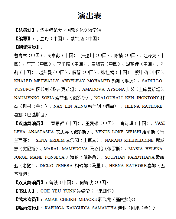 在诸多精彩节目中,由国际文化交流学院丁昱丹老师编导,教职工和中外学生共同完成的情境朗诵节目《读中国》以诗词朗诵为基础,融汇民族舞蹈、中华武术、中文歌曲等元素,将中华文化的博大精深展现得淋漓尽致。舞台上美轮美奂的演出离不开每一位教职工和学生的付出,从诗词的选取到发音的纠正,从国际学生中文歌的演唱到国风舞蹈的编排,从书法作品的撰写到太极拳的展示,所有人都倾注了满腔热情与心血。