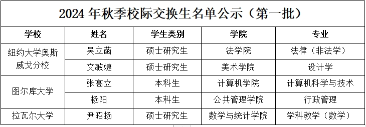据我校2024年秋季校际交换生项目(第一批)相关要求,在个人申请的基础上,经留学生管理工作办公室会同校内相关职能部门审核遴选,拟选派法学院吴立菡等5名同学赴海外学习交流。