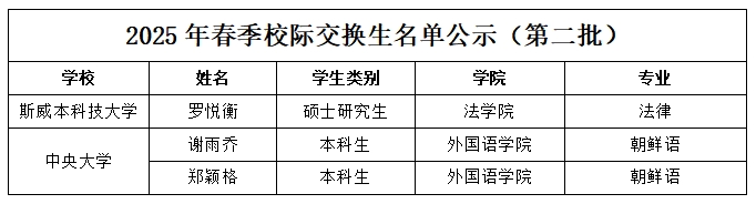 据我校2025年春季校际交换生项目(第二批)相关要求,在个人申请的基础上,经留学生管理工作办公室会同校内相关职能部门审核遴选,拟选派法学院罗悦衡等3名同学赴海外学习交流。