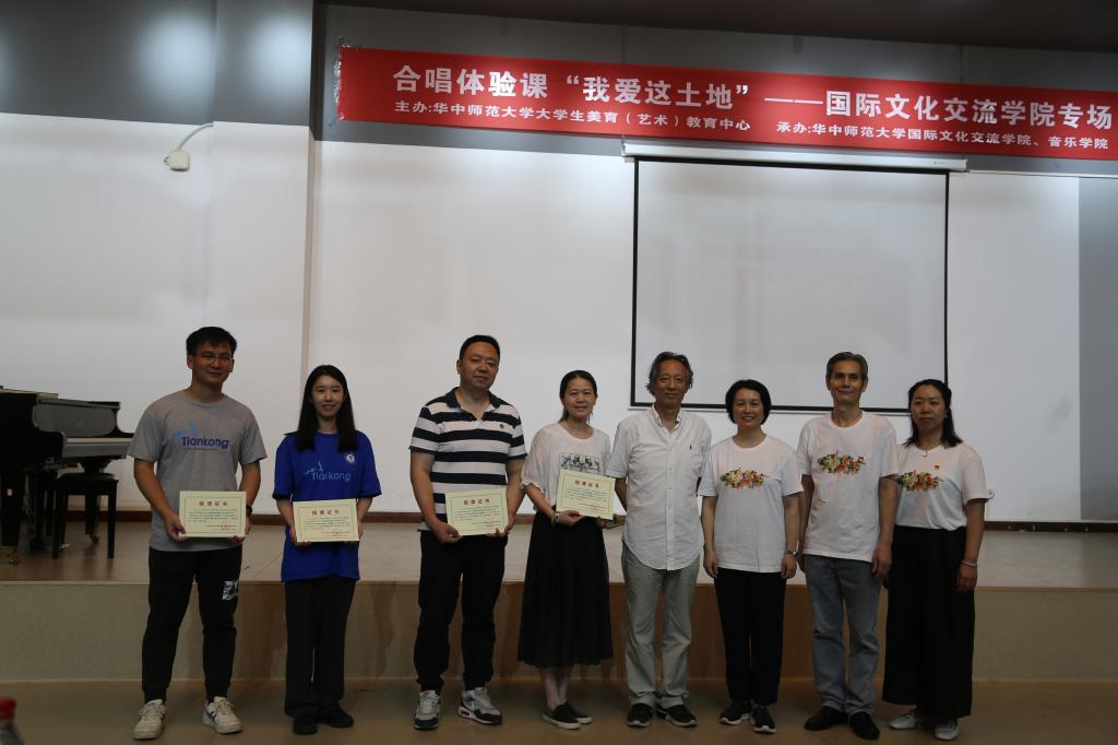 全体师生在田晓宝教授指挥及Tiankong合唱团成员领唱下,合唱华中师范大学毕业歌《爱你》。王琍书记、高卓献院长等为此次活动指导教师颁发纪念证书,全体师生集体合影。