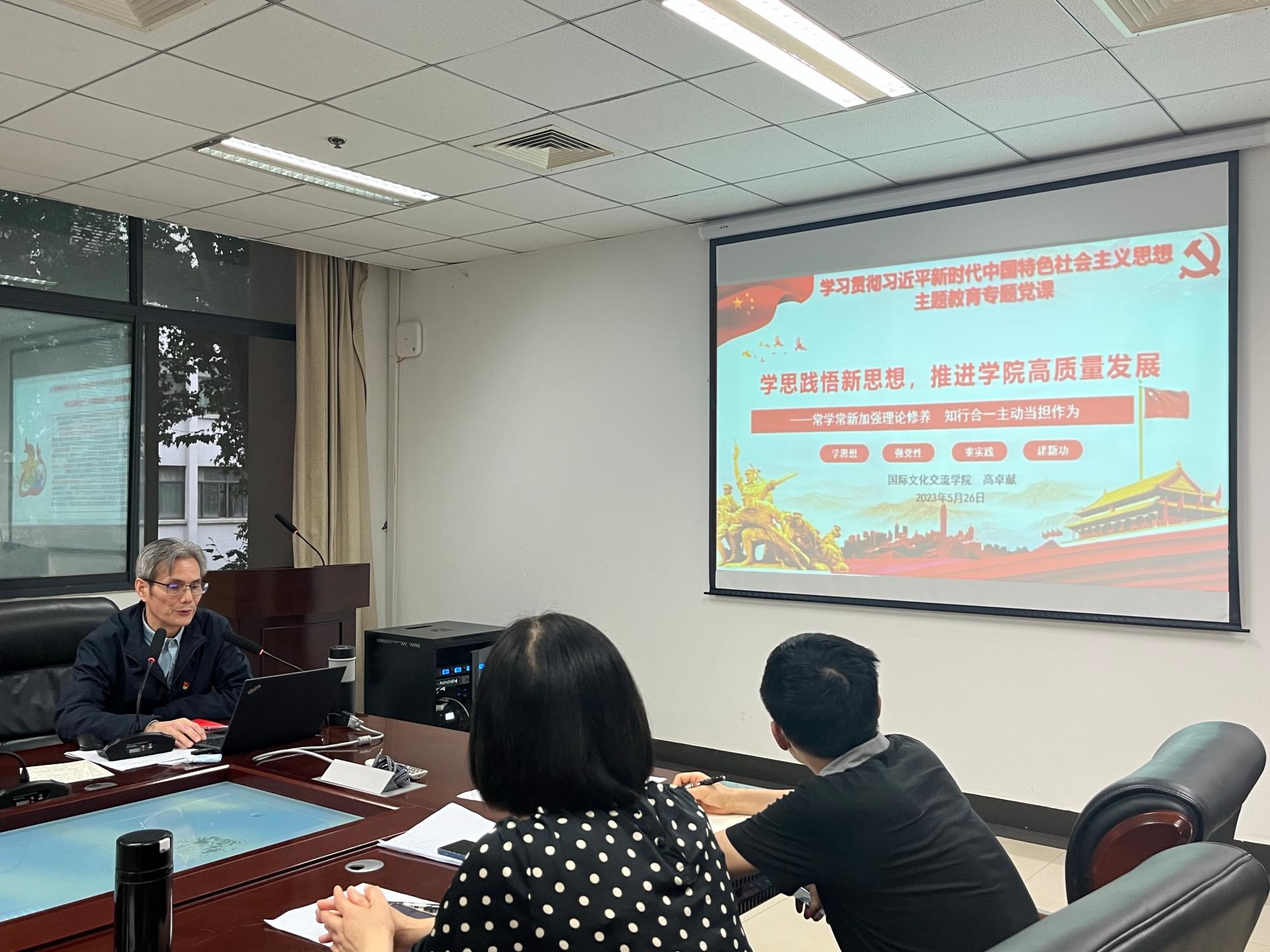 党总支副书记、院长高卓献以《学思践悟新思想,推进学院高质量发展》为题为全院教职工讲授主题教育专题党课。他强调要深刻领悟习近平新时代中国特色社会主义思想精髓要义;以学增智、以学促干,奋力推进学院高质量发展;以主题教育为契机,今年重点解决“问题清单”。他指出,新时代国际学生教育“趋同化”管理与培养势在必行,要进一步加强国际学生校友工作,推进“汉语+”特色长短期非学历教育培训项目及国际中文教育校际交流合作办学项目开发。